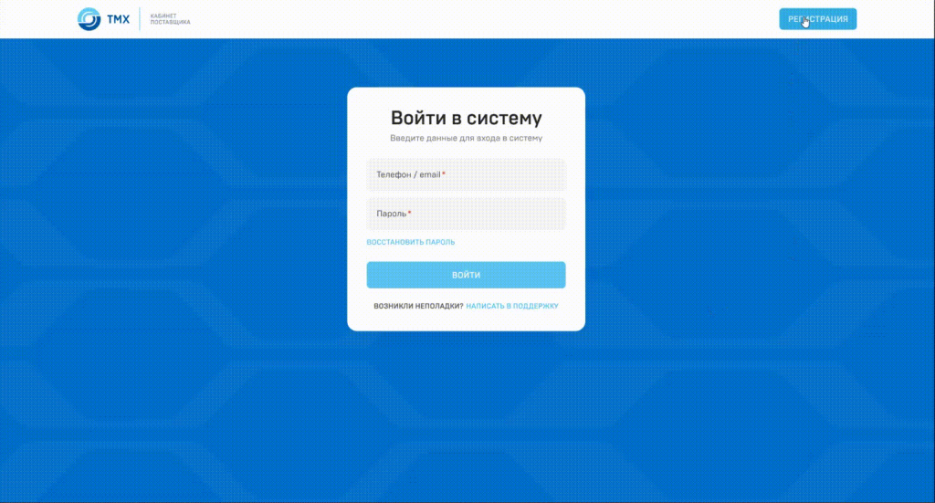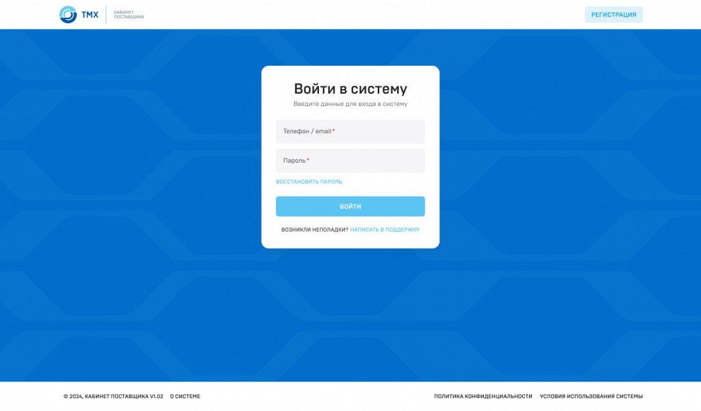 На изображении: Страница входа в систему “ТМХ – Кабинет поставщика”